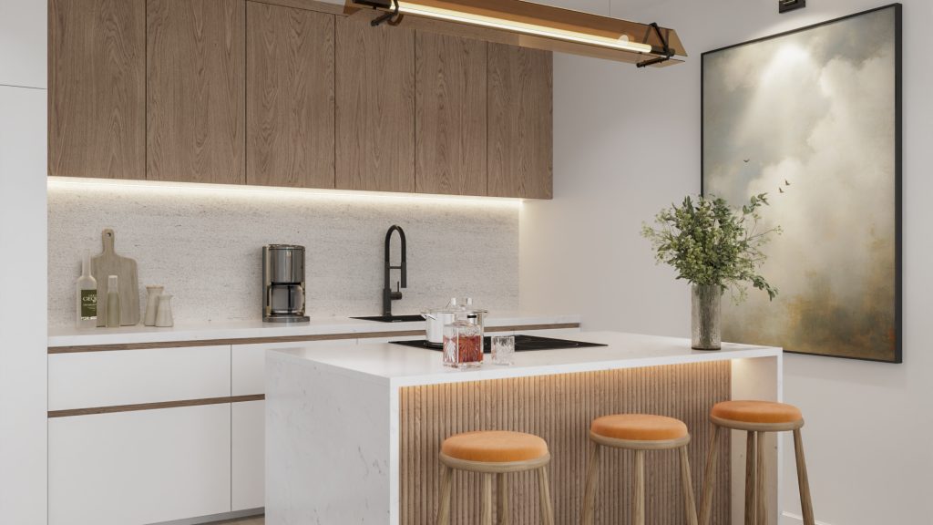 Internally, the apartments offer modern open-plan living complemented by refined specification including high-quality flooring, bespoke fitted storage, stone worktops and underfloor heating. The design strikes a balance between everyday comfort and long-term practicality, ensuring the homes are easy to live in and straightforward to maintain.