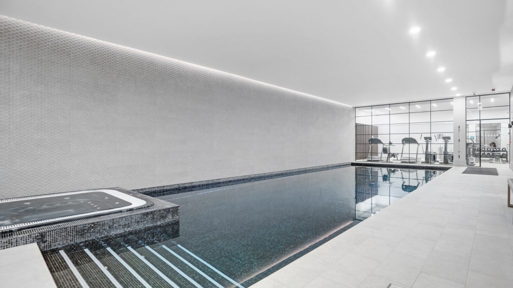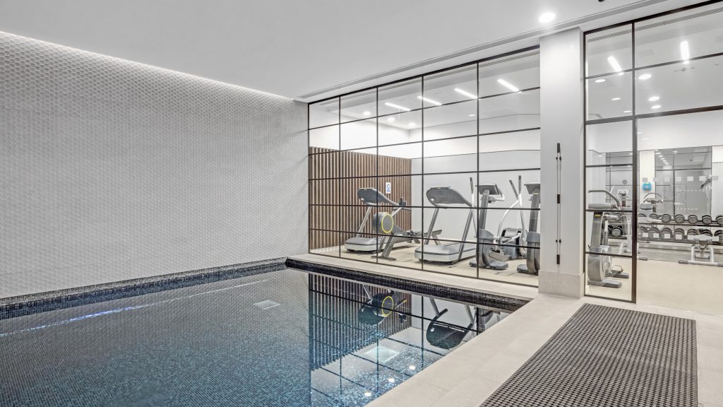 Leisure centre — residents enjoy access to a private gym, swimming pool, sauna, and steam room, open daily from 6am–10pm.